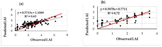 Observed vs. predicted LAI using RF-optimized models: (a) wet season data; (b) dry season data.