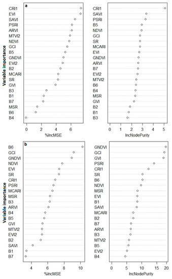 The RF generated variable important results identified CRI1 (carotenoids reflectance index 1) as the most important variable for the wet season. Carotenoids function as the light absorption processes in plants and is related to high chlorophyll concentration. Thus, for the wet season data, CRI1 was ranked as most important predictor variables. Similarly, SAVI was identified as the second-most important variable for predicting LAI in tropical savanna ecosystems [38,39]. For the dry season, the GNDVI was identified as the most important variable. Since chlorophyll content is low during the dry season, the green band tends to be more sensitive to chlorophyll than the red channel [38,40,41,42]. The results indicated that visible bands’ reflectance sensitivity to LAI varied seasonally.