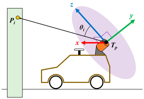 Definition of scan coordinate system and scan angle where Tp is the origin of the scanner for the scan point Pi with its scan angle θi, and the x-axis is horizontal.