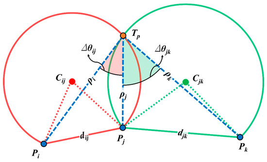 Initial estimation of the scan origin where Pi, Pj, and Pk are three scan points with the differences in scan angles Δθij and Δθjk; the red and green arcs with Cij and Cjk as centers, respectively, are formed from the corresponding scan points; Tp represents the estimated scan origin of the scan points in this scanline.