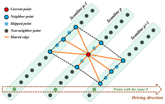 By sorting the points based on time stamps and knowing the scanner rotation speed, it is straight forward to search for the adjacent points along the same scanline. To define the adjacent points across the scanline at each point, we first project the points on the adjacent scanlines to the current scanline under analysis using the orientation of its scan plane, and compute the corresponding projected scan angles. Subsequently, we compare the scan angle of the current point under analysis against the projected scan angles, and amongst the points on the adjacent scanlines with a difference less than the angular resolution dθ, the closest points on the adjacent scanlines are selected. Then, the projected distances between a point and its neighbor points in the adjacent scanlines are computed and used for searching for neighbor points on the diagonals. We start searching for the diagonal neighbor points on both sides of each previously searched point on the adjacent scanlines where a point, with the minimum difference between its projected distance and its distance from the starting point. In this way, we can ensure that the neighbor points around each point are approximately evenly distributed.