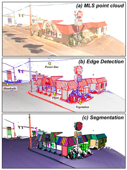 After grouping the points through region growing, each point is assigned by a random color based on its segment index (Figure 9c). Not only are the objects in a regular shape segmented correctly (e.g., power poles, the façade and roof of the buildings, road surface, curbs, and so forth), but also objects consisting of multiple parts can be well segmented (e.g., the business sign). Note that there are some objects shown to be over-segmented because the proposed region growing relies on the edge detection. For instance, the power pole is segmented to two segments because there are intersection edges detected at the nodes attaching to the pole for holding the power lines. There are also some objects under-segmented, such as the sidewalk and road surface because of the smooth ramp that links the sidewalk and road surface during region growing. Fortunately, with the result of the proposed framework, following refinement and analysis can be easily achieved as desired for a particular application based on the attributes of different objects of interest. For example, the sidewalk and the road surface can be separated within one segment, in this case, based on the elevation and the road boundary defined by the curbs. For the over-segmented objects, the segments belonging to one object can be merged based on the similarity of the geometric attributes and the distance between them. Nonetheless, these refinements to the extraction of specific objects are beyond the scope of this work, which focuses on presenting a generalized data processing framework.