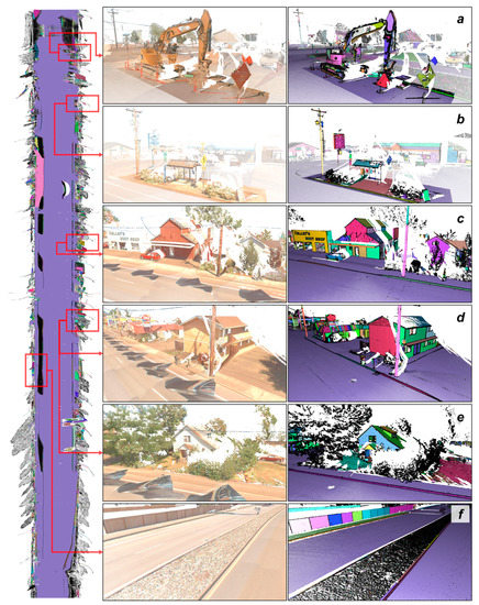 Driving at slow speeds provides a higher point density in the travel direction such that a complex object can be properly segmented into multiple parts (e.g., the excavator in Figure 10a). The result at a bus stop during a left turn of the mobile lidar system shows that the proposed method effectively works with both straight and curved trajectories. In this example, signs of different heights and sizes are well segmented, and the transformers and the associated arms are separated from the power pole (Figure 10b). Several additional buildings to Figure 9 are examined for demonstration (Figure 10c–e). The components (e.g., façade, roofs, windows, doors) on these buildings in different styles can be extracted. Notice that portions of the buildings are over-segmented when data gaps occur because the proposed edge detection approach extracts the boundary of the occlusions, such that region growing cannot connect the points on different sides of the occlusion (Figure 10c,d). To cope with such a situation, in addition to the aforementioned approach to merge the segments based on given criteria, there are two other potential solutions: (1) Mounting another scanner on the mobile lidar system in a different orientation; or (2) collecting data from multiple passes of the area of interest.