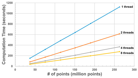 Exploiting the scan pattern grid structure and implementing the proposed algorithms in C++ with parallel programming ensures high efficiency of the proposed framework based on trajectory reconstruction and Mo-norvana segmentation. To evaluate this efficiency, we run the proposed framework on six mobile lidar datasets of different sizes collected in the same area using 8 threads. The performance of several other methods is also provided for reference (Table 5). Although the comparison between the proposed method and other methods can be impacted by the difference in scene complexity, hardware, running environment, and other factors, the summary shows that the computation efficiency of proposed framework based on Mo-norvana is significantly improved compared with the results reported in the other methods listed, particularly for larger datasets. The dataset size is a crucial factor for evaluating computational efficiency because the computational complexity of some methods exponentially increases with dataset size, causing a dramatic increase in the computation time with larger datasets. Therefore, we also test the proposed framework to illustrate the correlation between the data size and computation time utilizing different numbers of threads, which can be used to quantify the speed-up efficiency of parallel programming (Figure 13). The largest dataset used in this case contains approximately 263 million points, and the trend shows that the correlation between data size and computation time still follows a linear function.