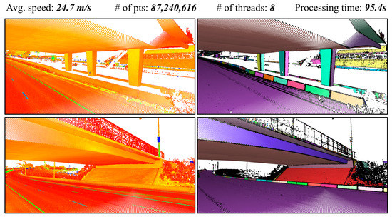 To further demonstrate the robustness and versatility of the proposed trajectory reconstruction and Mo-norvana segmentation, we test another dataset collected on an interstate highway (I-5) consisting of three lanes with shoulders on both sides. This dataset was acquired in the center lane with a speed (24.7 m/s), which is much faster than the previous tests, but still processed using the same values for the parameters. The proposed framework effectively copes with the faster driving speed to obtain an accurate and consistent segmentation result. The entire dataset (87,240,616 points) is processed within 95.4s using 8 threads. To illustrate the segmentation result, we select a small section containing several objects including the road surface, a bridge, jersey barriers, and so forth (Figure 14). The points lying on the road surface are well extracted as one segment. In addition, both the slab and the columns of the bridge are segmented into multiple objects, whilst most of the individual jersey barriers are properly separated. Although the mobile lidar data is segmented appropriately overall, the proposed framework fails to segment the light pole on top of the bridge, because of the low point density and distant range in this particular case. Fortunately, this limitation can be easily overcome by capturing such objects with a closer driving path such as acquiring mobile lidar data on that bridge if the light pole is of interest.