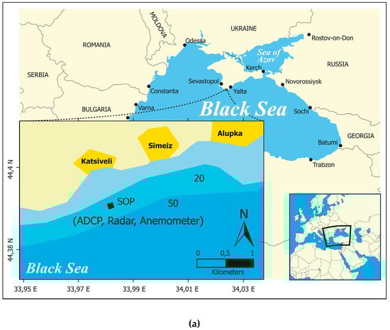 Experimental testing of the proposed methodology was carried out on the Stationary Oceanographic Platform (SOP) of the Black Sea Hydrophysical Polygon, the Russian Academy of Sciences. The location of the SOP on the map is shown in Figure 1a.
