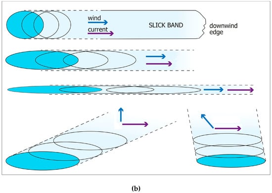 An artificial slick band was created by continuous outflow (dripping) of OLE and VO from a plastic tank with a 1.5 mm diameter hole in the bottom installed on the middle deck of the SOP at a height of 4.2 m. The process of slick band formation at different current directions and wind velocities is shown schematically in Figure 1b.