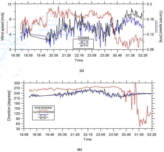 The measurements of: (a) speeds and (b) directions of wind and current during the experiment. The red curve is wind, black and blue show the current at depths of 1 and 5 m respectively. The direction is measured from the north direction (0 degrees).