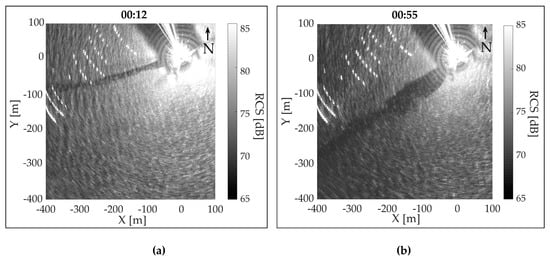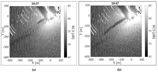 Examples of radar snapshots of slick band at different surface velocities: (a) 0.42 m/s, (b) 0.23 m/s.