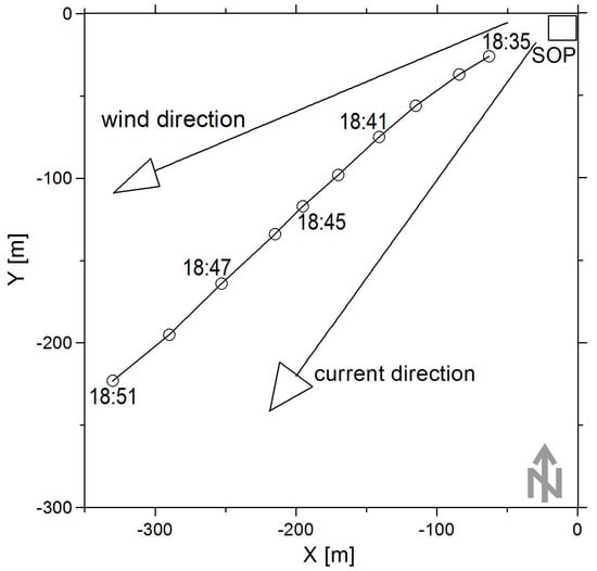The trajectory of the downwind slick band edge. The rectangle schematically indicates the SOP, the circles indicate the downwind edge band structure position, the arrows show the average wind and current directions during the band formation. Distances along the axes North (Y) and East (X) of the SOP are given in meters.
