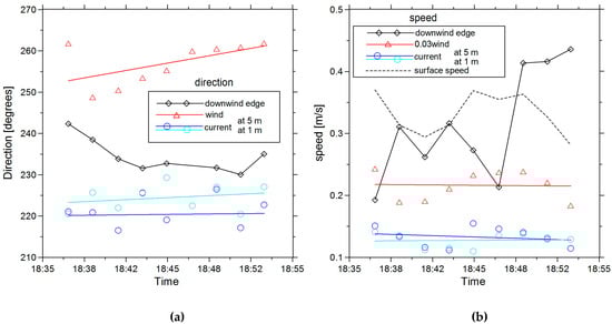 It can be concluded from Figure 7 that the band edge has been moving in the sector between the directions of wind and current. One should note that the movement of the band edge was not uniform and rectilinear. The direction of the band edge movement, as well as the directions of the current and wind, are presented in Figure 8a; the corresponding velocities are shown in Figure 8b.
