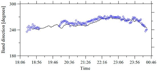 The band propagation direction Ds at a distance of 150 m from the SOP (black line) and the direction of the vector of the sum of the current speed in the upper layer and 3% of the wind speed (blue diamonds).