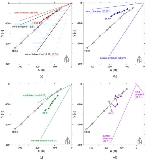 Figure 10 presents the positions of the slick band at different times in order to compare with band edge positions. It also indicates the directions of wind and current. Figure 10a describes the “reaction speed” of the band structure to a change of the wind direction. The band have been formed at 18:51, and the averaged image is obtained at 18:55. It is seen that at short distances from the SOP, the band does not react to the change of the wind direction, while at distances larger than 130 m, the change of the band direction becomes noticeable. This indicates again that the remote part of the band is the most informative. Figure 10b,c show how the direction of the band have changed after amplification and reduction of wind speed, respectively. Figure 10d indicates the effect of the band leaving the wind-current sector due to an abrupt, 180 degrees change in the wind direction. After the sharp reduction at 0:46 and the changed direction of the wind at 01:36, the band structure reformed along the current. At low wind speeds, the width of the band significantly increased and the morphology of the band became complicated; as a result, the determination of the band direction may be very difficult. Since the surfactants used in the experiment have similar physical characteristics (surface tension coefficients and elasticity), no significant difference between their dynamics is observed.