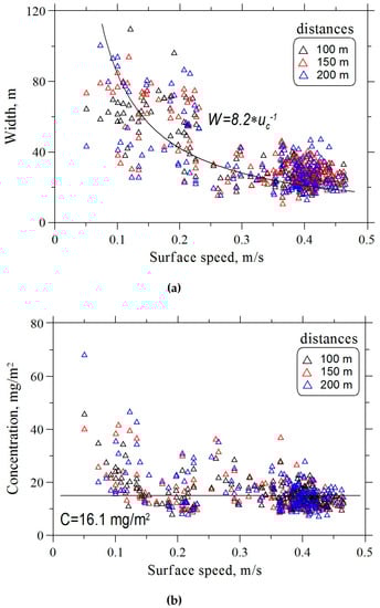 The obtained dependences indicate that at distances greater than 100 m from the SOP, the band can be characterized by a constant width, and the band spreading effects no longer manifest, since the scatter plots are uniform and do not separate depending on the distance from the SOP. The large scatter of points at lower surface velocities can be explained by the difficulties associated with slick band contouring under these conditions (Figure 11b). The calculated surface concentration of surfactants remains approximately constant over a wide range of surface speeds. This leads to the constancy of ucW along the slick band, and this fact makes it possible to retrieve the fine structure of the surface speed along the slick band.