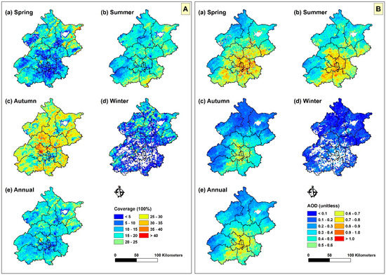 Seasonal-spatial distribution of VIIRS IP AOD (A) coverage and (B) average. (a–e) correspond to spring, summer, autumn, winter, and annual in subfigures (A) and (B).