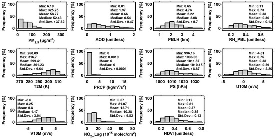 Figure 3 illustrates the histogram and several common statistics of all variables in the model dataset. Except for PRCP, the remaining variables were approximately normally distributed (AOD, PBLH, RH_PBL, T2M, PS, U10M, V10M, and NDVI) or log-normally distributed (PM2.5 and NO2_Lag). Overall, the mean values of PM2.5 and AOD were 58.15 μg/m3 and 0.65, respectively, indicating that the loadings of both surface and total aerosol particles were high in Beijing.