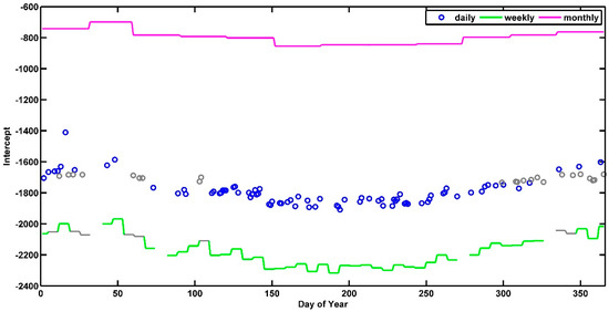 Variations of daily, weekly, and monthly intercepts of the first-stage nested TFER model. (N.B. Grey color indicates that the value was not statistically significant at α = 0.05).