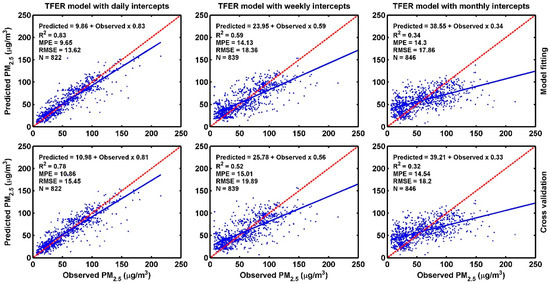Sample-based ten-fold cross validation (CV) was used to assess the performance of the first-stage nested TFER model. For the TFER models with daily, weekly, and monthly intercepts, the model dataset was first randomly and equally split into ten subsets with the condition that all the days, weeks, and months of each subset must appear in the remaining subsets. This condition was incorporated so that predictions could be made for each subset using the model fitted from the other nine subsets. The rest of the process was similar: repeat using nine subsets to fit the model and use the fitted model to predict the remaining subset until all the subsets have been predicted; regress the predicted PM2.5 on the observed PM2.5 and calculate the R2, mean prediction error (MPE), and root mean square error (RMSE); and use these statistics to assess model performance.