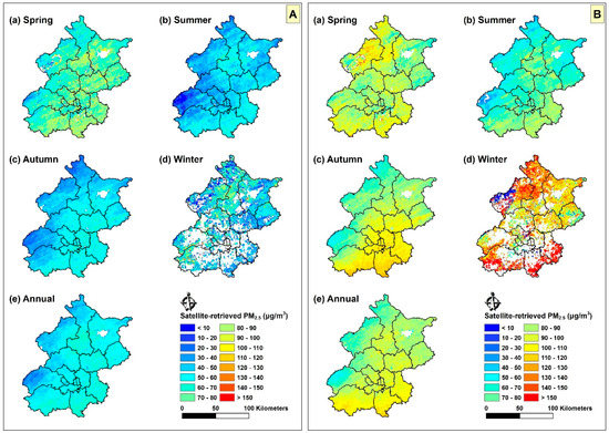 Figure 7 illustrates the seasonal-spatial distribution of satellite-based and ground measured PM2.5 concentrations. The PM2.5 predictions from the overall model were higher than those from the first-stage nested TFER model. These higher values were much closer to the real level shown in Figure 7C, indicating the necessity and effectiveness of adding the second-stage GWR models. In terms of the spatiotemporal pattern of PM2.5 pollution in Beijing, during summer, autumn, and the entire year, from the northwestern areas to the southeastern areas, a gradient of slight to severe PM2.5 pollution was observed. These gradual changes were consistent with previous studies [16,47] but this study provides more spatial detail thanks to the high spatial resolution of the VIIRS IP AOD retrievals. However, similar gradual changes did not occur during spring and winter, but noisy distributions were found instead. This phenomenon may be attributed to very low spatiotemporal coverage (Figure 2) plus the insufficiently high accuracy [22,23,24] of the VIIRS IP AOD retrievals, which constitutes one of the deficiencies of these retrievals and deserves attention and improvement in the future. In addition, the fact that large quantities of coarse particles intrude into Beijing during spring [48] might also badly influence the accuracy of PM2.5 estimates during this season. Seasonally, it was only possible to conclude roughly that PM2.5 pollution during summer was relatively slight.