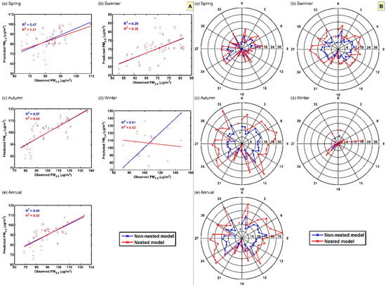 Comparisons between the estimated seasonal and annual PM2.5 concentrations from the nested and non-nested models. (A) regression analysis with the seasonal and annual PM2.5 observations from the 35 monitoring sites; (B) number of available daily PM2.5 estimates to calculate the seasonal and annual PM2.5 estimates). (a–e) correspond to spring, summer, autumn, winter, and annual in subfigures (A,B).