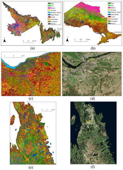 Provincial wetland inventory maps and zoomed images from two provinces: (a) Newfoundland and Labrador and (b) Ontario. (c) and (d) from Ontario and (e) and (f) from Newfoundland and Labrador demonstrate their visual accuracies.