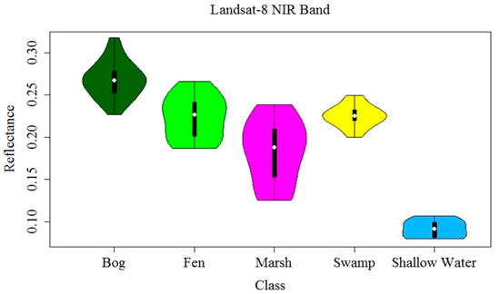 Violin plots of the wetland classes from the Landsat-8 Near Infrared (NIR) band. The white dot, thick black bar in the center and thin black line indicate the median value, interquartile range, and 95% confidence interval, respectively.