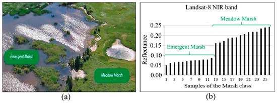 (a) Two subclasses of the marsh class, (b) spectral values of the field samples of the marsh class obtained from the Landsat-8 NIR band.