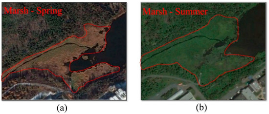 Third, because of the dynamic nature of wetlands, they can change significantly over time [39]. Therefore, their spectral characteristics differ as their vegetation cycles. For instance, a wetland in August (a dryer month) appears different from a that in June (a wetter month) in both field and satellite imagery, particularly in the case of highly saturated wetlands, such as marsh or shallow water. For example, marsh is brown in spring, while it is green and elevated in summer (Figure 8).