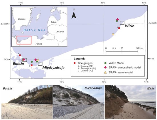 The hydrometeorological data used in this study combined both observational and modeled datasets (Table 1). Wave parameters from the high-resolution operational WAve Model (WAM) were validated for the Baltic Sea in the framework of the Hindcast of dynamic processes of the ocean and coastal areas of Europe (HIPOCAS) project [31]. One minor gap lasting 6–7 h for two WAM points corresponding to the Bansin and Międzyzdroje cliffs was filled by interpolation. Three larger gaps in the wave and wind parameters for all locations, lasting a total of 36 days (within December 2016, June 2017, and February 2018), were filled using the fifth major global climate reanalysis dataset produced by the European Center for Medium-Range Weather Forecasts (ERA5) [32]. As the resolution of the ERA5 reanalysis model, which represents wave conditions further from the coast, is far coarser than the WAM data, the ERA5 values were corrected by a constant factor for each location, variable, and data gap. The constant factor was computed by dividing the average WAM values for the available days within each month during which a gap occurred by the average ERA5 reanalysis values.
