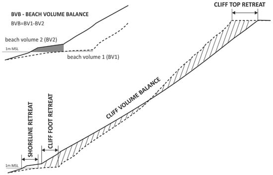 Finally, to explore how the beach–cliff system changed between each LiDAR survey, line indicator migration as well as volumetric changes was analyzed. The results were separately determined for beach and cliff areas between the lines in 50 m wide sections. Similarly, for the needs of Bayesian network analysis, all line indicators were marked on profiles using the same 50 m spacing as the volumetric measurements.