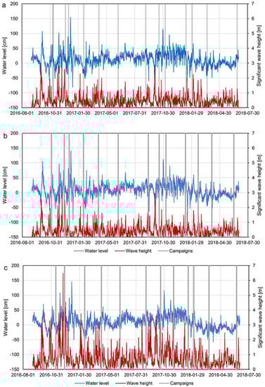 Water levels, significant wave height, and timing of the LiDAR measurement campaigns at (a) Bansin, (b) Międzyzdroje, and (c) Wicie. Water levels obtained from the tide gauge measurements, and wave heights obtained from the WAM model.
