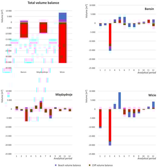 During the monitoring period, the sediment budget was definitely negative with a total loss of 49,330 m3. Erosion was most significant on the cliffs (over 58,000 m3), while a positive budget was observed on the beaches, with a value slightly exceeding 9000 m3. This positive balance shows that not all of the cliffs’ material was swept into the sea, but some of it remained on the beaches.
