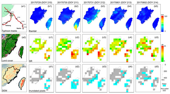 Nasha and Haitang were two successive typhoon events that occurred on 29–31 July 2017. These two events brought great disasters mainly to two provinces of China, Fujian and Taiwan. Figure 2 shows the daily variations of precipitation (GPM-derived, b1–b5), SR (CYGNSS-derived, c1–c5) and the inundated areas of Fujian and Taiwan (SR-derived, d1–d5) during and after the typhoon events. Since the available specular points of the daily CYGNSS data are sparse, the SR and inundated areas are gridded into 50 km resolution.