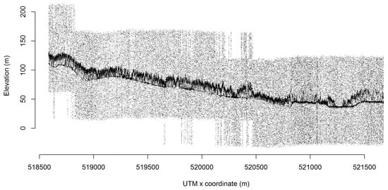 The profile of the photon counting LiDAR data from SIMPL within the Howland Research Forest. The horizontal x-axis stands for the UTM x coordinate; the vertical y-axis stands for the ellipsoidal height.