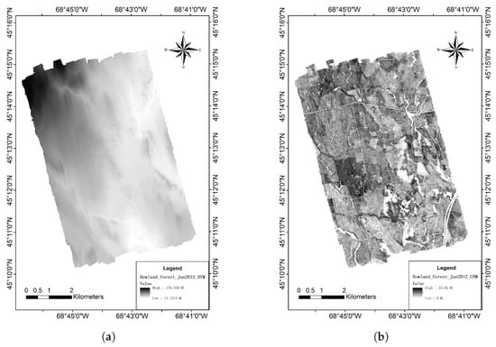 The airborne small footprint LiDAR data from G-LiHT was collected in June 2012, which is near the acquisition time of the SIMPL data. G-LiHT is a portable, airborne imaging system that simultaneously maps the composition, structure, and function of terrestrial ecosystems using a combination of LiDAR, Hyperspectral, and Thermal sensors. G-LiHT’s profiling LiDAR is an LD321-A40 (Riegl USA, Orlando, FL, USA), multi-purpose laser distance meter which produces a 50 cm diameter footprint at the nominal operating altitude of 335 m []. Figure 3a,b shows the 1 m resolution Digital Terrain Model (DTM) and the Canopy Height Model (CHM) driven from the point cloud of G-LiHT.