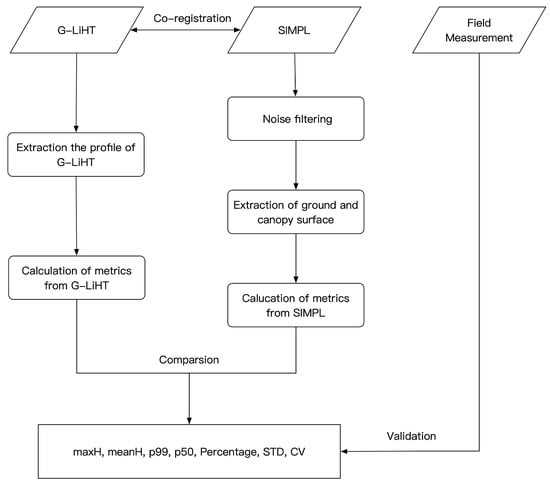 The method we use in this study is shown in Figure 4. The method is divided into 4 parts: first, we extract the ground and canopy surface from the potential signal photons identified by the noise filtering algorithm using a local outlier factor (LOF) with an elliptical searching area []. Next, a co-registration technique based on moving profiling is applied between SIMPL data and G-LiHT data to correct the geolocation error. Then, we calculate the height metrics from both photon counting LiDAR data from SIMPL and airborne small footprint LiDAR data from G-LiHT. Finally, we investigate the relationship between the two sets of metrics, and use the stem map from field measurement to validate the results.
