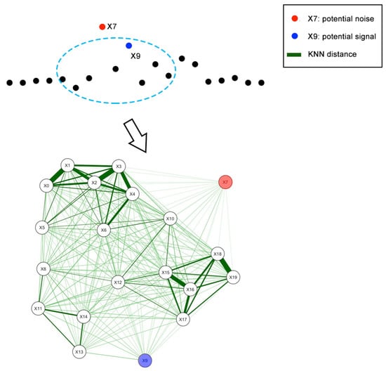 Figure 5 demonstrates the distance matrix from the ellipse searching shape. The red dot stands for point X7 and the blue dot stands for point X9. It can be seen from the figure that for a horizontal ellipse searching area, the potential noise point X7 can be distinguished from the signal point X9.