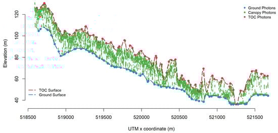 The result of forest signal detection from SIMPL data is shown in Figure 6. It can be seen from the result that our method can separate the forest signal from the noise effectively. The photons which belong to the TOC, ground and within the canopy are well detected, especially in a quite high noise rate environment in relatively rough terrain across our study site. It is also noticeable that the TOC surface and ground surface are extracted accurately.