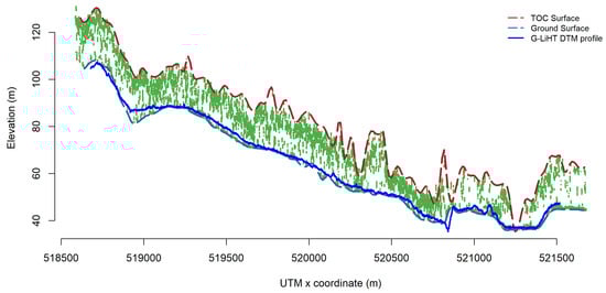 Figure 7 demonstrates the result of the moving profiling method to match the SIMPL and G-LiHT data. The red dash line represents the TOC surface; the grey dash line represents the ground surface, and the blue line represents the best fitting G-LiHT DTM profile, which is considered to be the shift that produced the minimum RMSE between the SIMPL and G-LiHT DTM profile. It can be seen that with the correction of the geolocation, the co-registration between SIMPL and G-LiHT data has been improved.