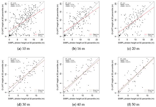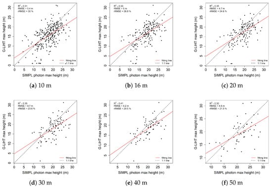 These findings are consistent with previous waveform LiDAR studies which showed that LVIS data (with a footprint size of 25 m in diameter) gives better estimation than GLAS data (with a footprint size of 70 m in diameter) [,]. It is also confirmed by simulation studies which prove the optimal footprint diameters of 25 and 30 m []. Also, study focus on MABEL data showed similar findings that 50 m is not always the optimal size to estimate the maxH [].