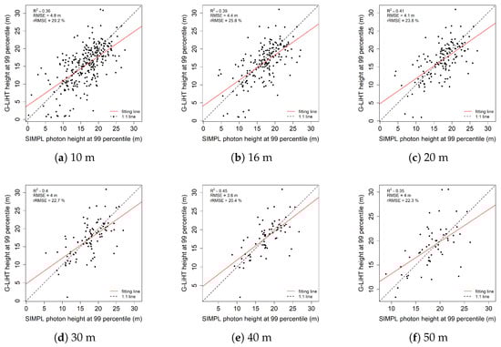 The results of the max tree height related metrics from SIMPL data show good consistency with those from G-LiHT. Figure 8 shows the relationship between the max value of all photon heights from SIMPL and the max value of all return heights from G-LiHT for different scales. It can be seen from these figures that the 40 m scale has the highest value of R-square and the lowest value of RMSE. In terms of the results of max height, Figure 9 shows similar findings for the 99th height percentile. The mean R-square values for all these six different scale sizes are 0.35 and 0.39 for the max value of height and the 99th height percentile respectively. The 99th height percentile has a slightly higher overall accuracy over the max height metrics with an increasing percentage of 3–6%. The mean value of the RMSE for the max values of height and the 99th height percentile are 4.8 m and 4.2 m respectively, which shows a difference which is over 4 m for the estimation of max tree height in our study site.