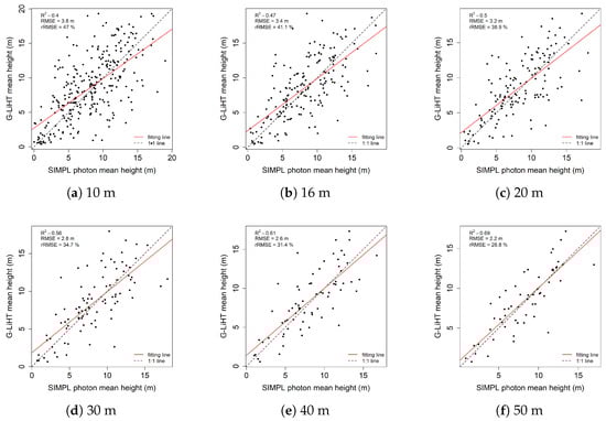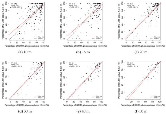The fraction of the number of photons above 1.3 m from SIMPL, which is considered to be related with the canopy cover, shows good consistency with the metrics from G-LiHT as demonstrated in Figure 12. The mean values of R-square and RMSE for all these six different scale sizes are 0.6 and 16% respectively, of which the best fitting result is for the 50 m scale size with an R-square over 0.6 and RMSE less than 15%.