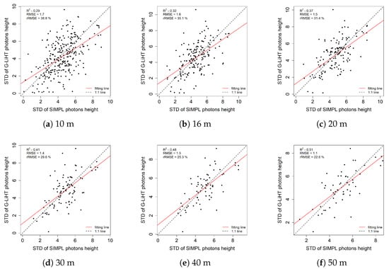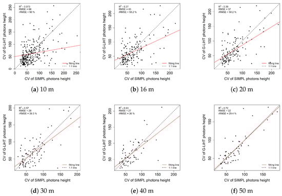 Similarly, we investigate the consistency of the remaining two height metrics which are standard deviation (Figure 13) and coefficient of variation (Figure 14) of photon heights, which are indicators of the variability of the data. We find that the estimation accuracy for these two metrics increases with a larger scale size, especially for the coefficient of variation, where the R-square improved from 0.073 to 0.72.