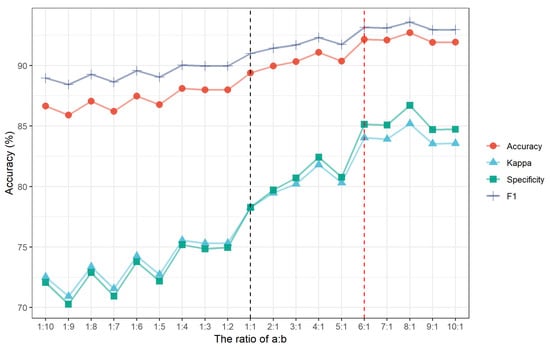 The ellipse searching area is determined by the ratio of the major and minor axis, the empirical ratio (a:b = 6:1) used for SIMPL data here is based on our previous testing results with 30 different MABEL/MATLAS data. Figure 15 shows the accuracy respond to various combinations of a and b. It can be seen from the figure that the four statistical indicators including accuracy, kappa coefficient, specificity, and F1, become stable at the ratio of 6:1. Although there is a small increase for specificity and F1 at the ratio of 8:1, the overall accuracy and kappa coefficient does not necessarily increase accordingly.