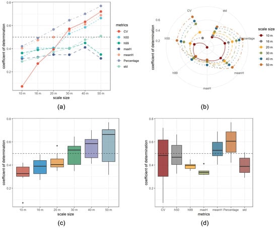 The results of mean tree height related metrics including the 50th height percentile and mean value of heights are shown in Figure 10 and Figure 11. The mean R-square values for all these six different scale sizes are 0.54 and 0.49 for the mean value of height and the 50th height percentile respectively. It shows that the overall accuracy to estimate mean tree height for the different scales is better than those of max tree height metrics with improvements of 19% and 10% respectively. Also, we can see the mean height metric has a higher overall accuracy compared with the 50th height percentile, with an increasing percentage of 3–10% for the different scale sizes. Compared with metrics related to the max tree height, the mean values of the RMSE for the mean value of height and the 50th height percentile are 3 m and 4 m respectively, of which the best fitting result is at the scale size of 50 m with an R-square of 0.69 and RMSE of 2.2 m for the mean value of height. It is also noticeable that with a smaller scale size, the range of the rRMSE values of meanH is 26.8–47% compared with those values of 21.3–30% from maxH, suggesting that the maxH maintains relatively good estimation for small scale sizes.