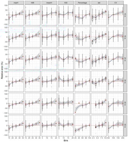 The relative error distribution of different bins for metrics at various scale sizes. The vertical y-axis represents the relative error (measurements from G-LiHT are used as reference values); the numbers in horizontal x-axis represent certain bin sizes. For example, in maxH graph, 15 stands for tree height within 0–15 m; 20 stands for 15–20 m; 25 stands for 20–25 m; 30 stands for 25–30 m; 35 stands for tree height above 30 m.