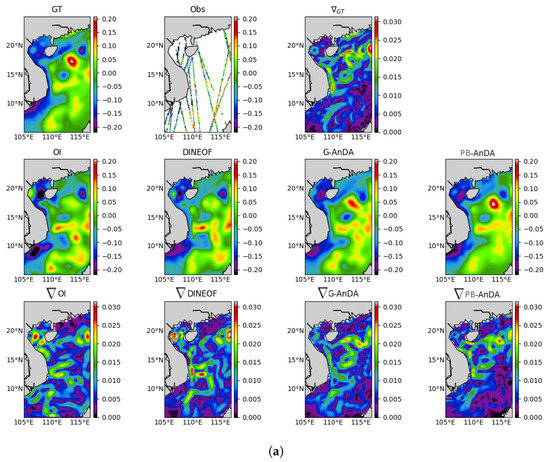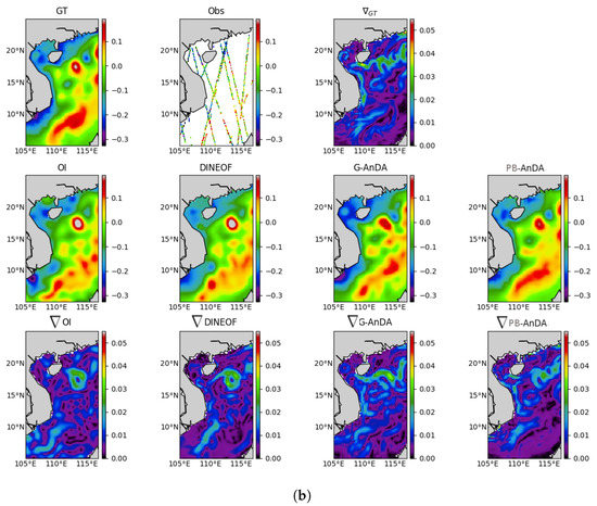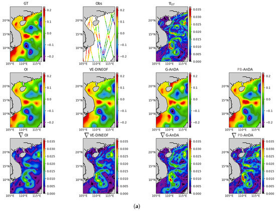 Reconstruction of SLA fields (meters) from noisy along-track data using OI, VE-DINEOF, G-AnDA & PB-AnDA on day 225th (a) & 228th (b).
