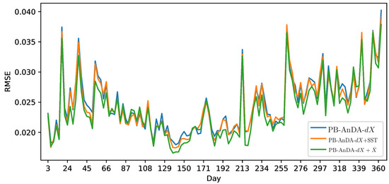 Daily RMSE (meters) time series of PB-AnDA SLA reconstructions using noisy along-track data for different choices of the regression variables in the locally-linear analog forecasting model: PB-AnDA- (light blue), PB-AnDA- SST (orange) and PB-AnDA- (green).