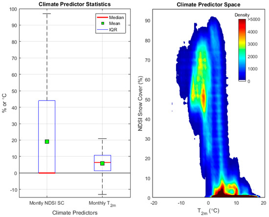 Characteristics of the monthly mean climate predictor dataset used in the model fitting exercise: (Left) Statistics; (Right) Density scatter. “IQR” = interquartile range; “NDSI” = Normalized Difference Snow Index; and “SC” = Snow cover.