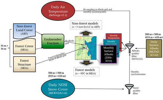 In the present study, we employ observation-based datasets of Norwegian land cover and structure, near surface air temperature, and MODIS-based snow cover (MOD10A1 v6) to spectrally unmix MODIS surface albedo (MCD43A3 v6) and to study spatial-temporal variations in surface albedo as a function of land cover, forest structure, and the environmental state. Our primary objective is to develop and present a set of simple land cover-dependent empirical models for Norway that facilitate high fidelity predictions of the surface albedo at a monthly resolution. This resolution is deemed appropriate as major intra-annual surface albedo dynamics play out over seasonal timescales. Furthermore, the monthly resolution makes the models amenable to inputs obtained from gridded historical climate observation products or from climate model scenario runs whose outputs are often provided at the monthly resolution. Unlike existing global [12] and national [25] land cover-dependent albedo datasets based on MODIS surface albedo products, our method does not require constraining the analysis to pixels that are homogeneous with respect to single land cover types, thus enabling a more efficient use of MODIS data. Given the relatively low nominal spatial resolution of the MODIS albedo product (i.e., 500 × 500 m), this is particularly important for regions, such as Norway, where the land cover and structure are relatively heterogeneous at small spatial scales. Furthermore, because spatial-temporal variations in the surface albedo not only depend on variations in land cover and structure but on local environmental conditions affecting the state of vegetation, soils, and snow, we include snow cover and near surface air temperature in our analysis since these factors are known to greatly affect the surface albedo either directlyor indirectly [26,27,28,29].